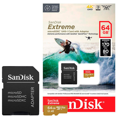 Cartão Micro SD SanDisk Extreme 64GB U3 V30 A2 com Adaptador SD 170MB/s - SDSQXAH-064G-GN6MA