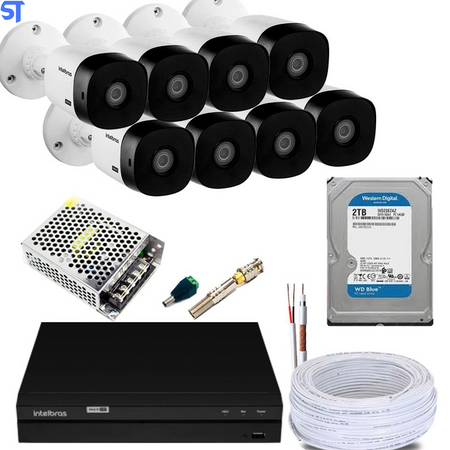 Kit Sistema de Câmeras Intelbras Com 8 Canais+ HD de 2TB + Fonte 10A+ 100 Metros de Cabo e Conectores