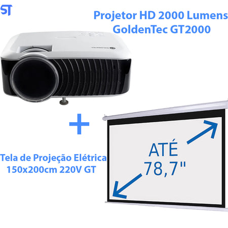 Projetor HD 2000 Lumens Goldentec GT2000 | Com Tela de Projeção Elétrica 150x200cm 220V GT