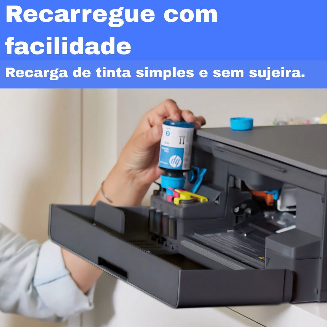 Seu sistema de tanque de tinta de alto rendimento garante um dos menores custos por página do mercado, com reabastecimento simples e limpo. A conectividade Wi-Fi facilita o uso por diversos dispositivos, como notebooks, tablets e smartphones, através do aplicativo HP Smart, que torna a impressão remota intuitiva e funcional.