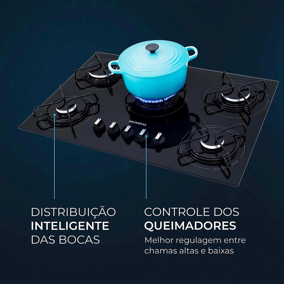 O Cooktop 5 Bocas a Gás GLP Mondial CTG-02 é a combinação perfeita de potência, segurança e estilo, projetado para transformar sua experiência na cozinha com desempenho excepcional e um visual elegante, com a qualidade garantida da Mondial