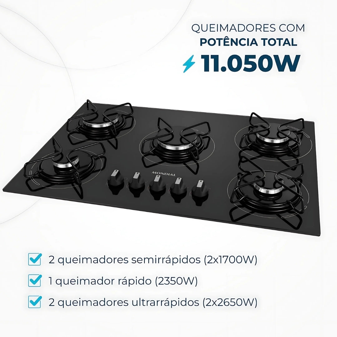 Alta Potência: 11.050W para cozimentos rápidos e eficientes com cinco queimadores versáteis.