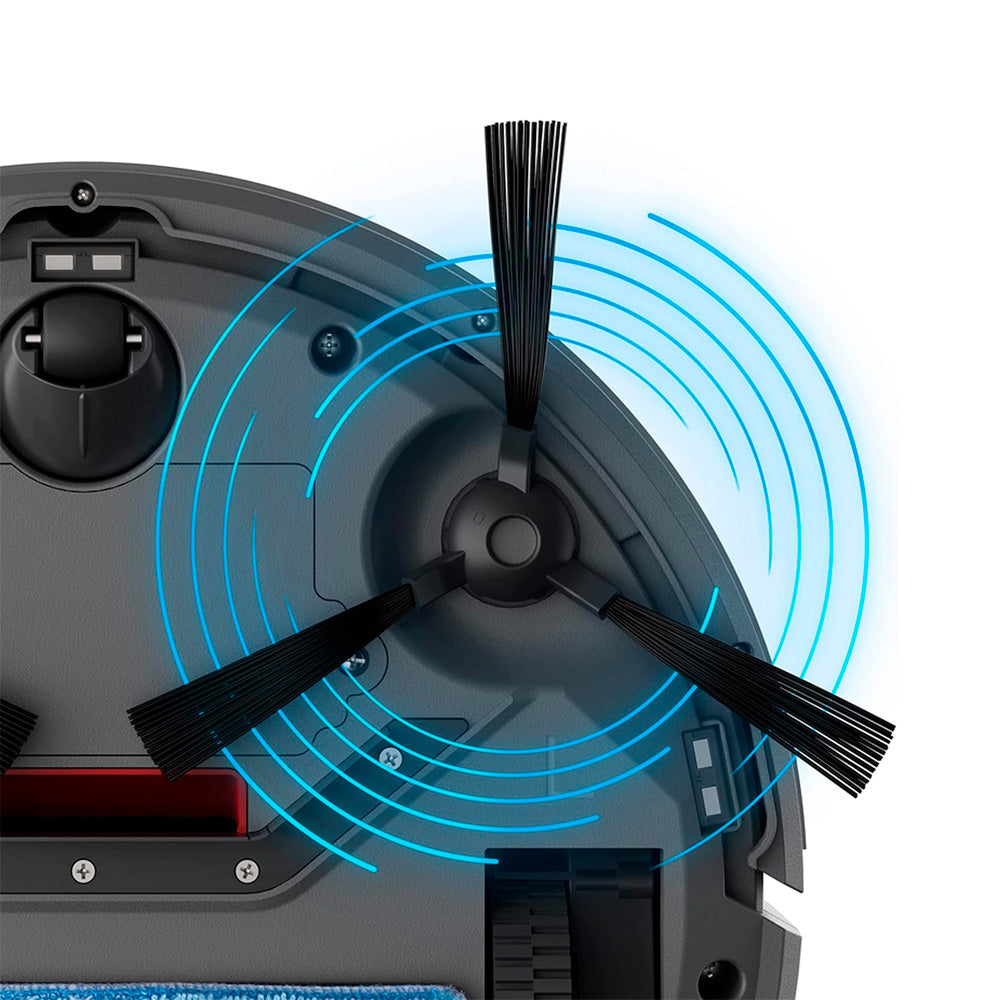 As duas escovas laterais alcançam cantos e bordas, capturando poeira e pelos, enquanto a função MOP passa pano seco para um acabamento polido. O filtro HEPA Allergy Protect remove ácaros, poeira fina e alérgenos, devolvendo ar mais puro. O sensor antiqueda infravermelho detecta desníveis, garantindo navegação segura em casas com escadas ou varandas.