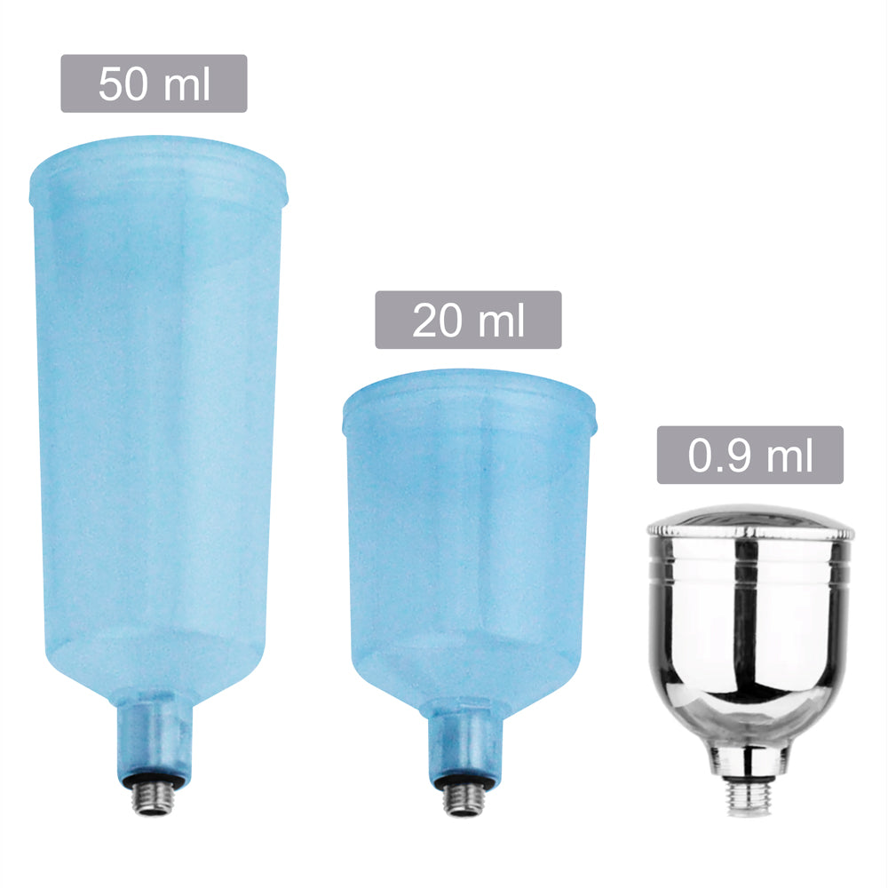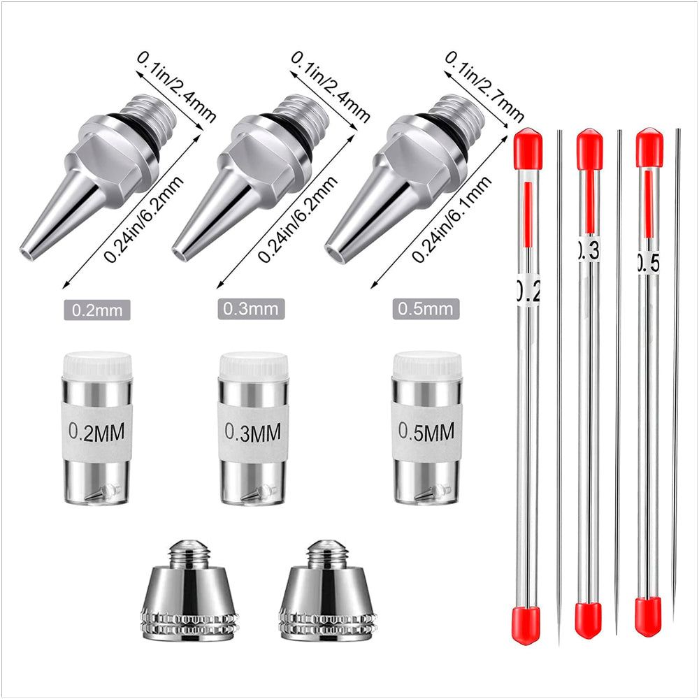 Aerógrafo de dupla ação com bicos de 0,3mm, 0,4mm e 0,5mm.