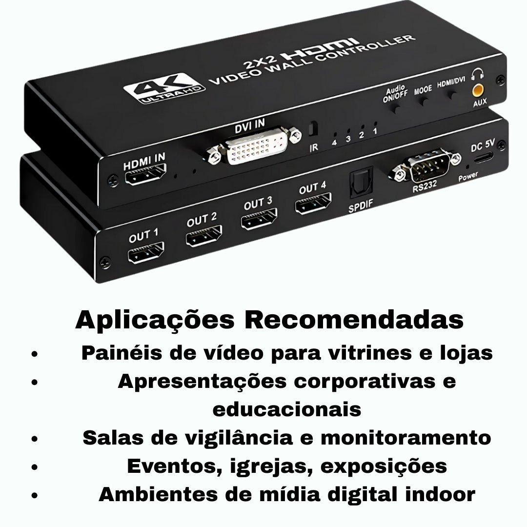 Ideal para ambientes corporativos, salas de monitoramento, eventos, lojas, igrejas, universidades e publicidade digital, este controlador proporciona uma solução acessível e eficiente para montagem de painéis de vídeo (video walls) com excelente resolução e sincronismo. Compatível com qualquer fonte de sinal HDMI, como notebooks, reprodutores multimídia, câmeras ou centrais de segurança.