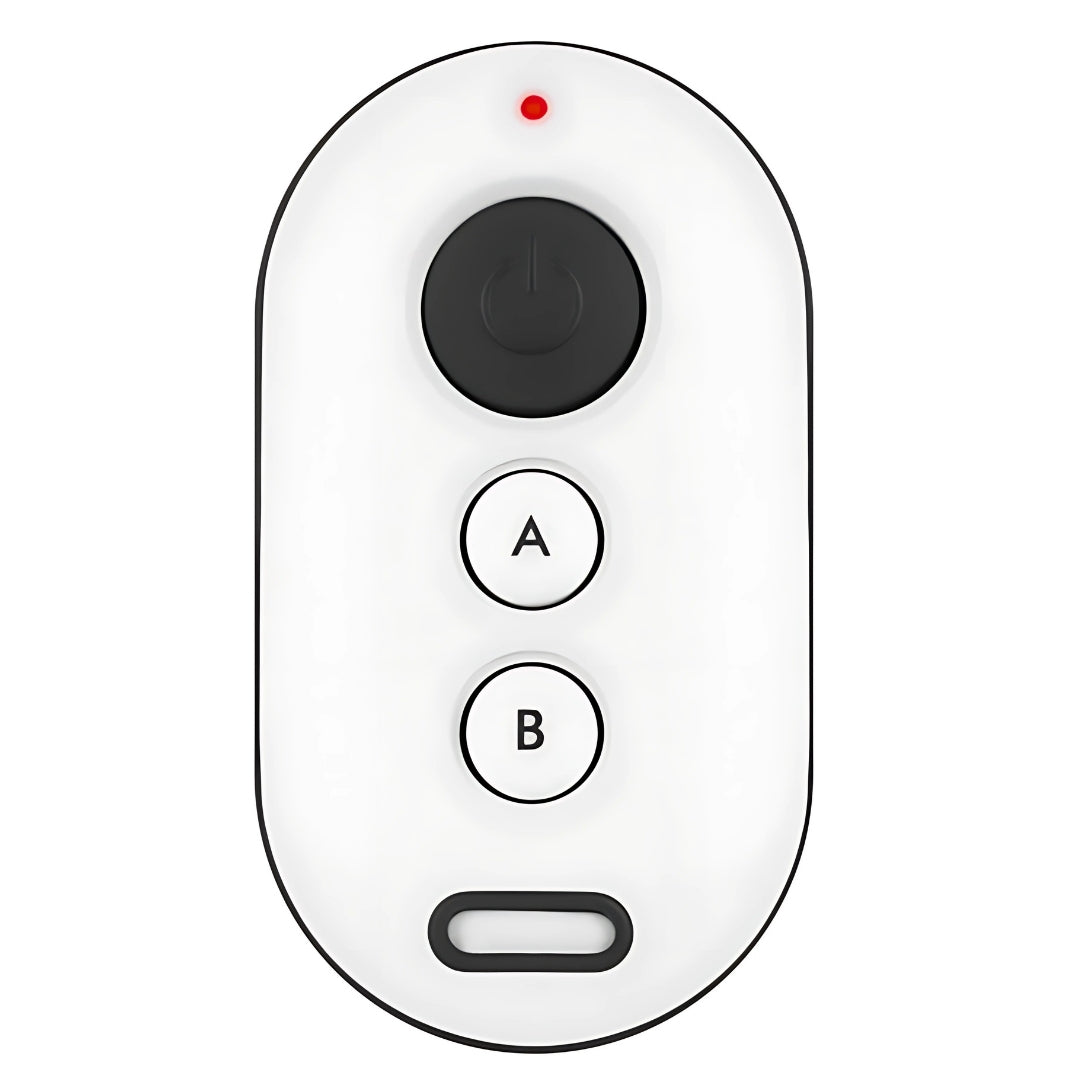 O controle conta com design compacto e moderno, acabamento bicolor (preto e branco), dois botões de acionamento, e permite o controle de até dois dispositivos distintos. A alimentação é feita por bateria de longa duração (modelo CR2032 inclusa), com baixo consumo energético, ideal para uso prolongado.