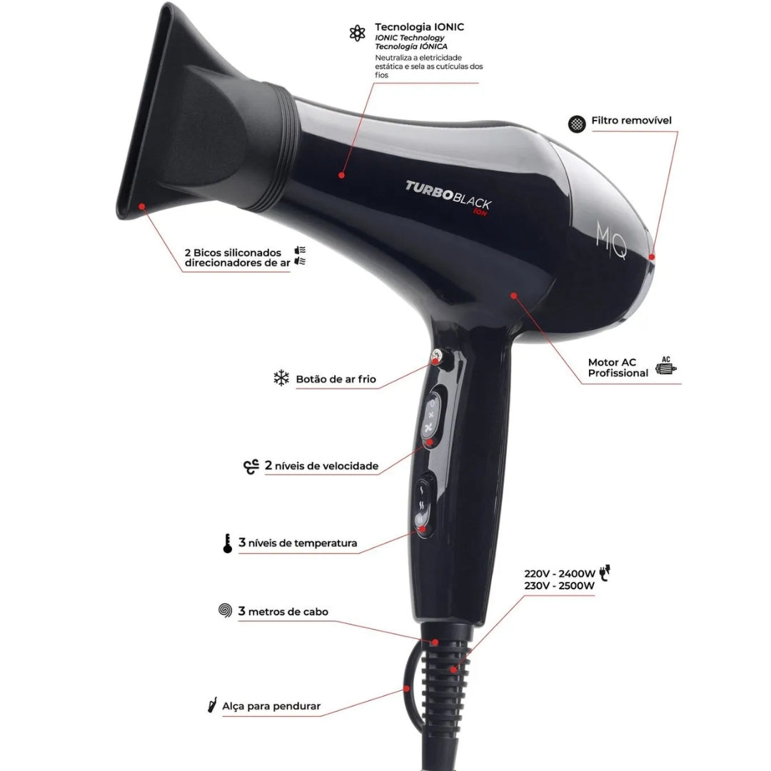 O Secador de Cabelo MQ Professional Turbo Black é sinônimo de potência, resistência e alta performance. Com 2500W de potência real e motor AC profissional de longa duração, este equipamento é ideal para salões de beleza e usuários exigentes que desejam resultados superiores em menos tempo. Desenvolvido com foco em eficiência térmica e ergonomia, ele oferece um fluxo de ar potente e constante, permitindo uma secagem rápida, modelagem precisa e acabamento profissional.