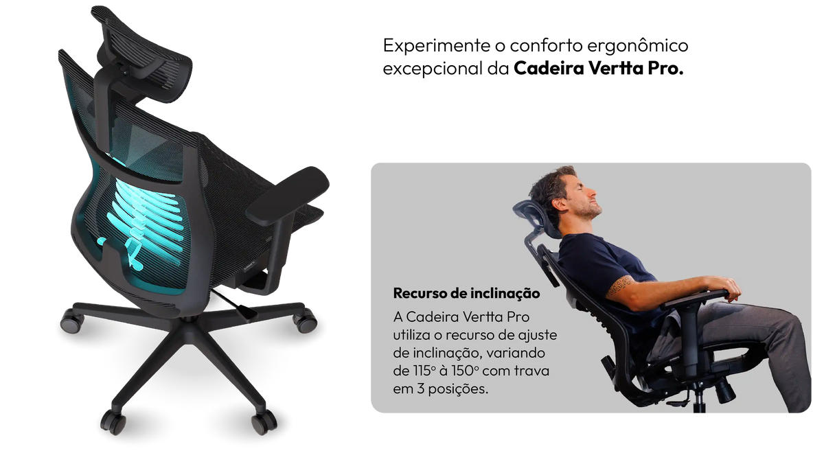 A Vertta Pro destaca-se pela ergonomia avançada, com um mecanismo sincronizado que reclina encosto e assento simultaneamente até 150° em 3 posições, com ajuste de tensão da mola para maior conforto em momentos de descanso. O apoio lombar ajustável em 3 níveis alivia a pressão na coluna, enquanto o encosto em mesh premium se adapta às curvas do corpo, promovendo alinhamento postural. Os braços 3D permitem ajustes de altura, profundidade e ângulo, garantindo suporte personalizado para braços e ombros. O cilindro classe 4 oferece ajuste de altura em 7 níveis (43-55 cm), adaptando-se a diferentes biotipos e mesas. Certificada pela BIFMA, suporta até 150 kg com estabilidade, ideal para longas jornadas de trabalho ou gaming sem fadiga.