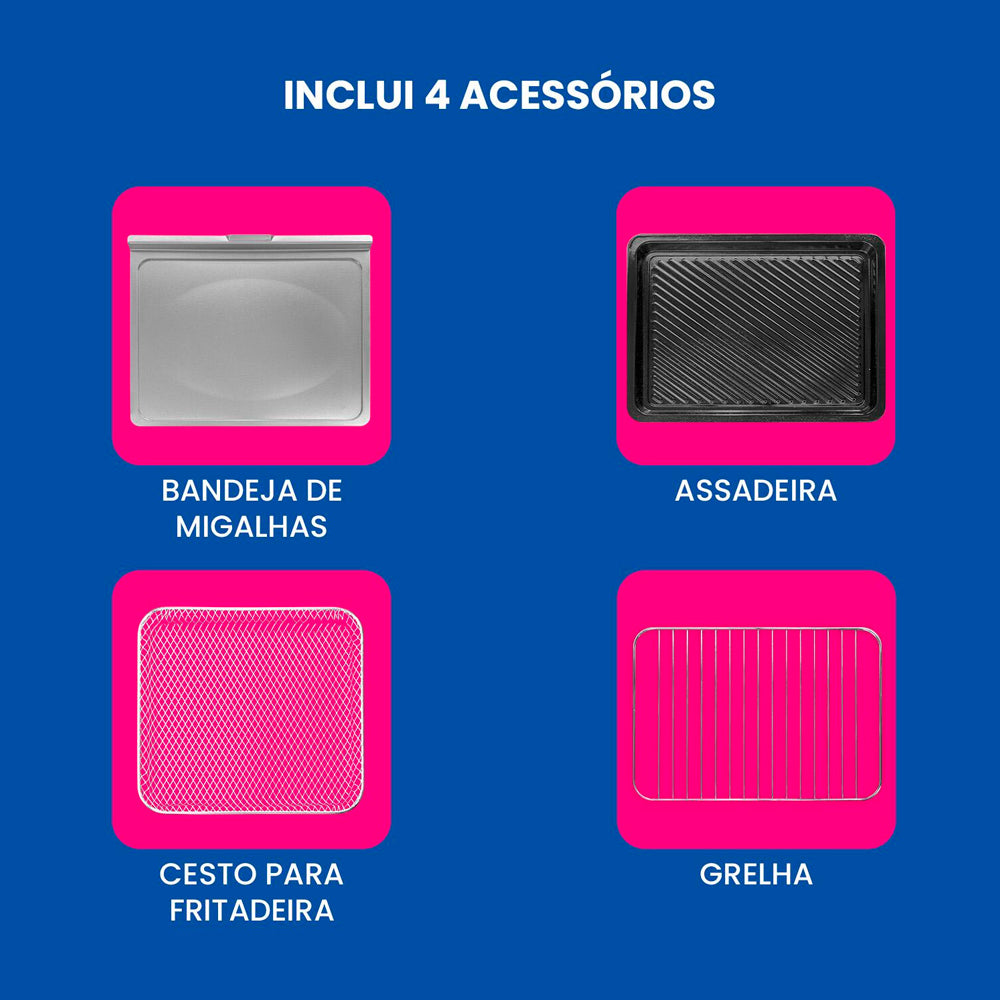 Acessórios inclusos: Assadeira antiaderente, cesto de air fryer, bandeja de migalhas removível e grelha.