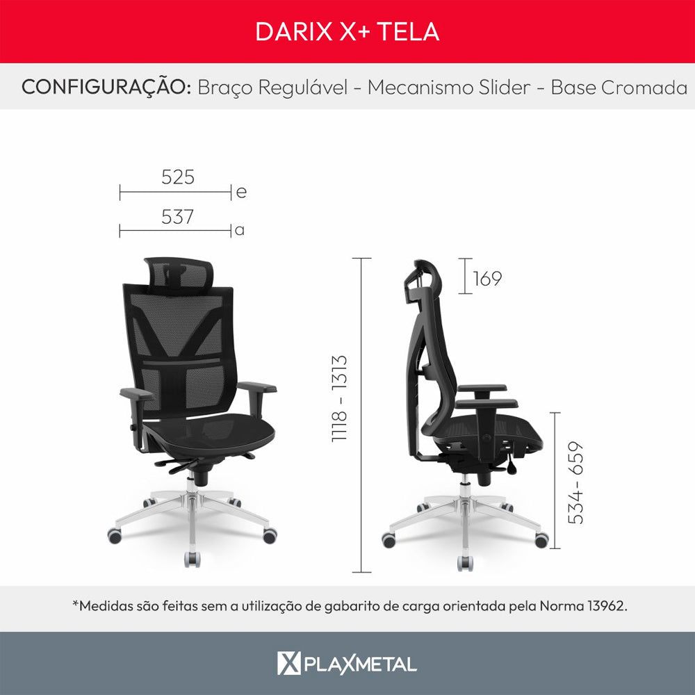 Durabilidade Superior: Construída com materiais de alta resistência, a Cadeira Presidente Darix X+ é projetada para suportar o uso diário intenso, mantendo sua aparência e funcionalidade ao longo do tempo.