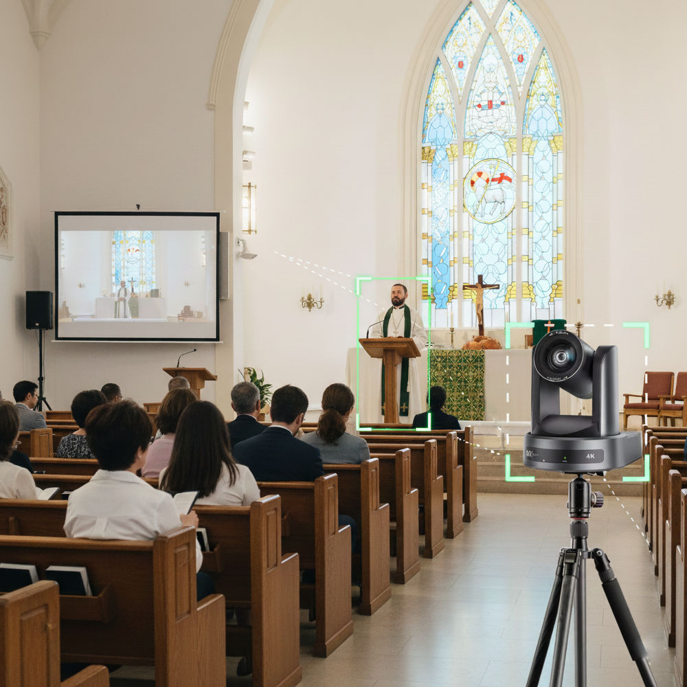 A Câmera PTZ 4K/1080P é projetada para oferecer transmissões com qualidade superior em reuniões, palestras, cultos e eventos híbridos. Com sensores avançados de imagem e lente de alta precisão, ela captura detalhes nítidos mesmo em ambientes com baixa iluminação. O zoom óptico de 10x ou 20x garante enquadramentos precisos sem perda de qualidade, proporcionando uma experiência de vídeo realista e envolvente.