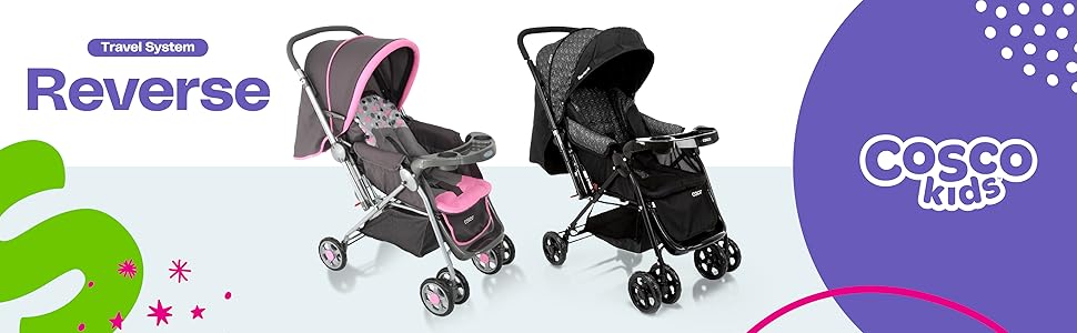 O conjunto Travel System Reverse TS DUO da Cosco é composto pelo Carrinho Reverse e o bebê conforto Wizz, para garantir o conforto e a segurança do bebê nos passeios de carro, em casa ou nas ruas. O carrinho tem inclinação do assento em 3 posições, cinto de 5 pontos com protetores, colchonete macio e alça reversível para que o bebê recémnascido possa passear virado para os pais e ter todo cuidado e atenção que essa esta fase exige, além da capota ajustável e ampla com bolso para pequenos objetos.
