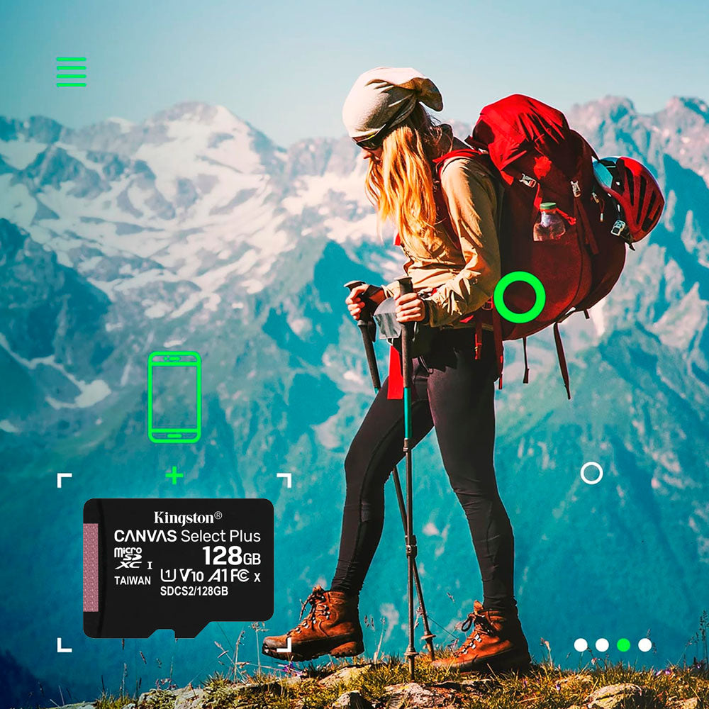O Kingston Canvas Select Plus é compatível com uma variedade de dispositivos, incluindo smartphones, câmeras digitais, drones e outros dispositivos que suportam cartões microSD, tornando-o uma escolha versátil para suas necessidades de armazenamento.