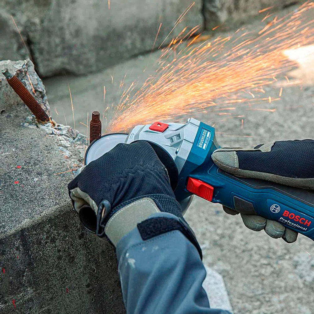 A Esmerilhadeira a Bateria de 5' Bosch GWS 180-LI tem flange de metal que aumenta a vida útil da ferramenta, assim como o motor sem escovas de carvão.