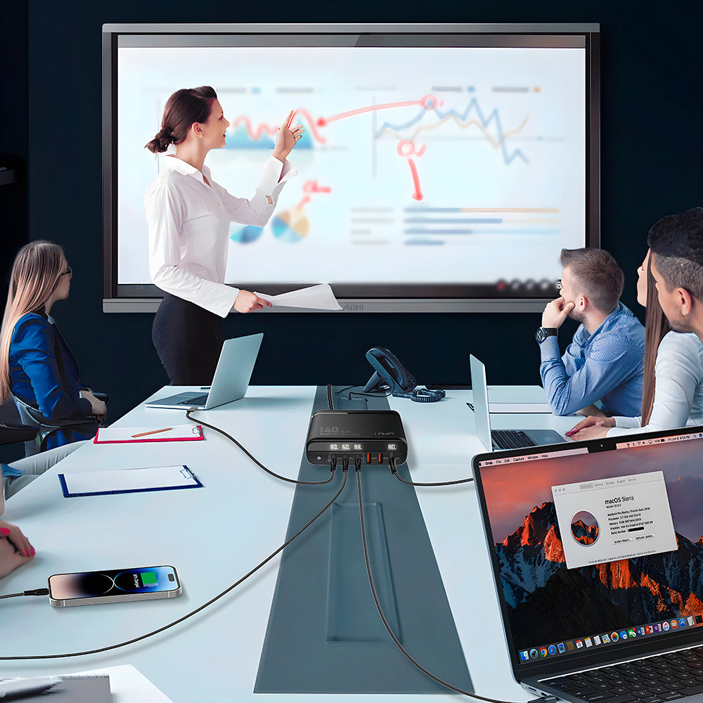 - Capacidade de Carga Total: Com uma potência total de 140W, a estação é capaz de fornecer carregamento rápido e eficiente para múltiplos dispositivos ao mesmo tempo.