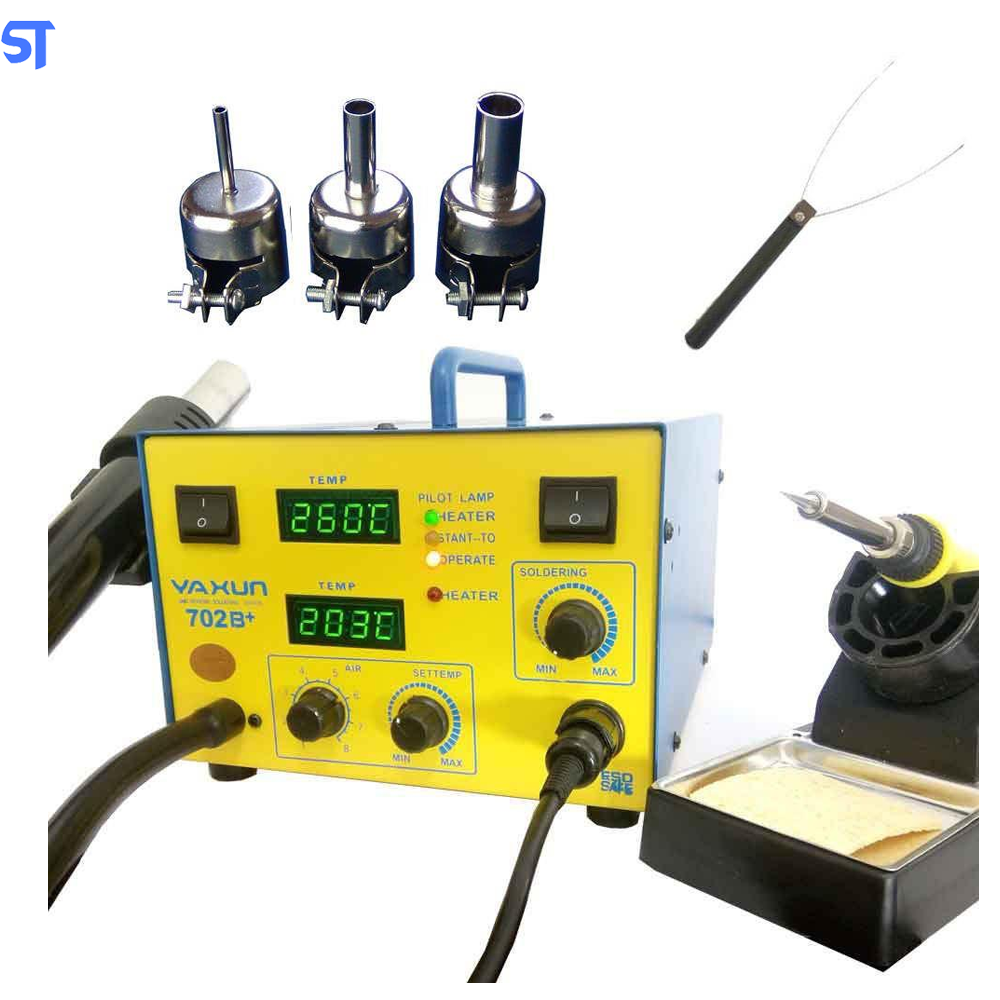 Vale relembrar a grande diversidade de equipamentos úteis que acompanham a Yaxun 702: 1 suporte para o ferro de solda com esponja vegetal, 1 suporte para o soprador de ar, 1 pinça / extrator para remoção de chip’s SMD e 5 diferentes bocais para o soprador.
