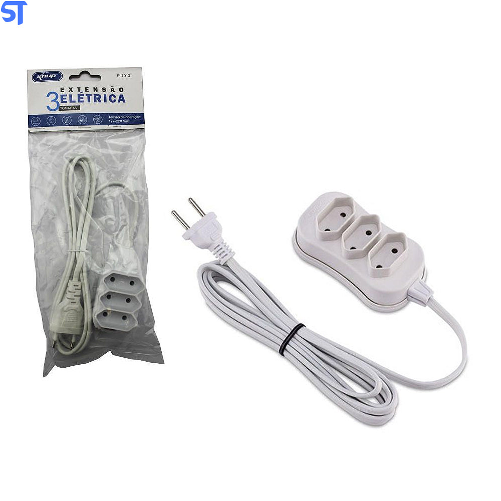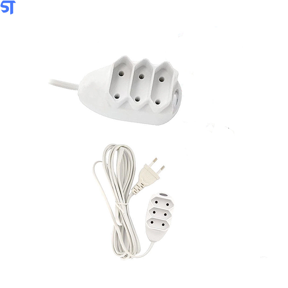 Extensão Elétrica 3 tomadas, Disponível na versão de 1,5 metros, com plugue 2P 0, 75mm2 para 10 Amperes de corrente e tomadas com maior espaçamento.