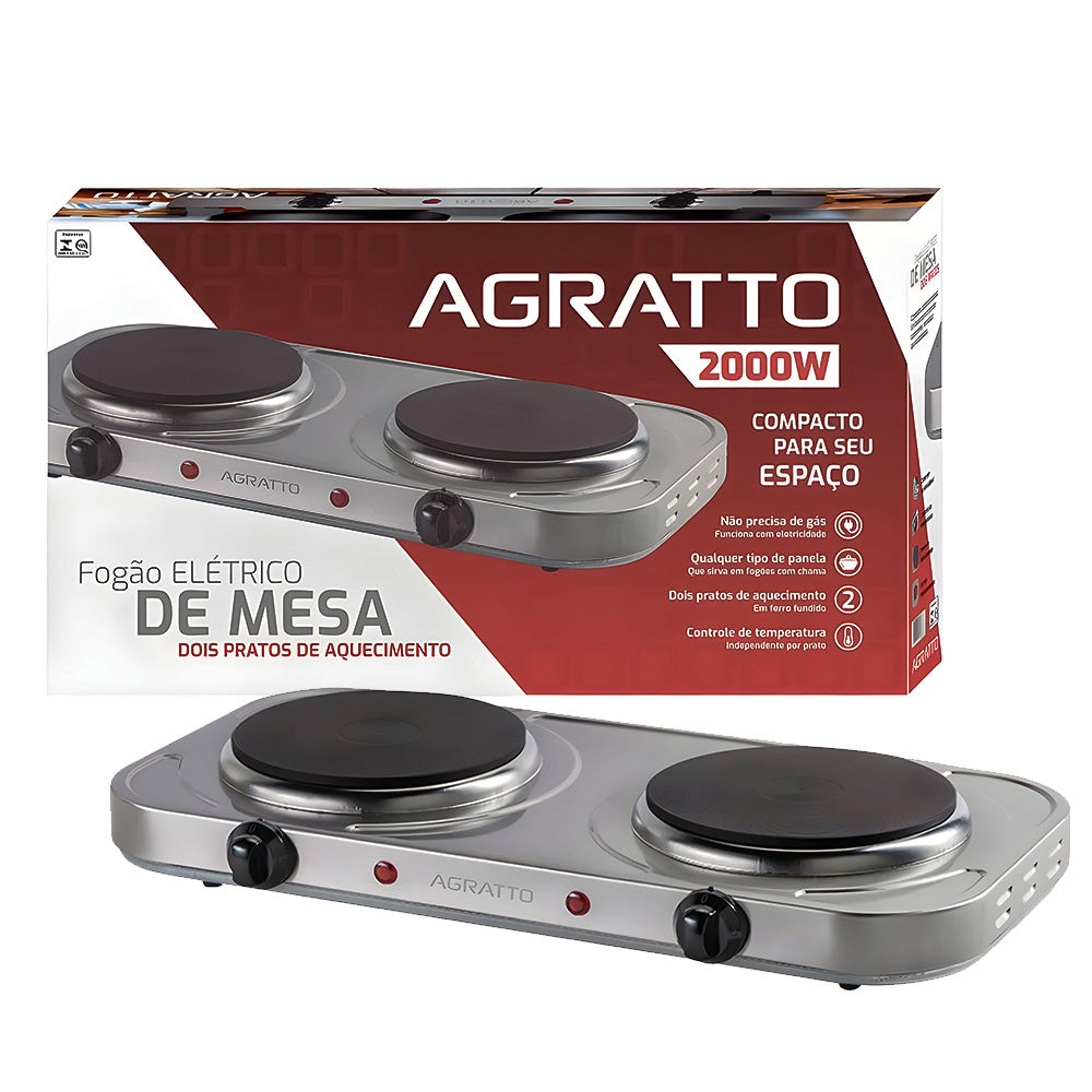 O fogão elétrico 2 bocas agratto possui corpo em aço inox, para uso doméstico, e prato com revestimento antiaderente, é capaz de preparar qualquer tipo de alimento ou apenas aquecer.