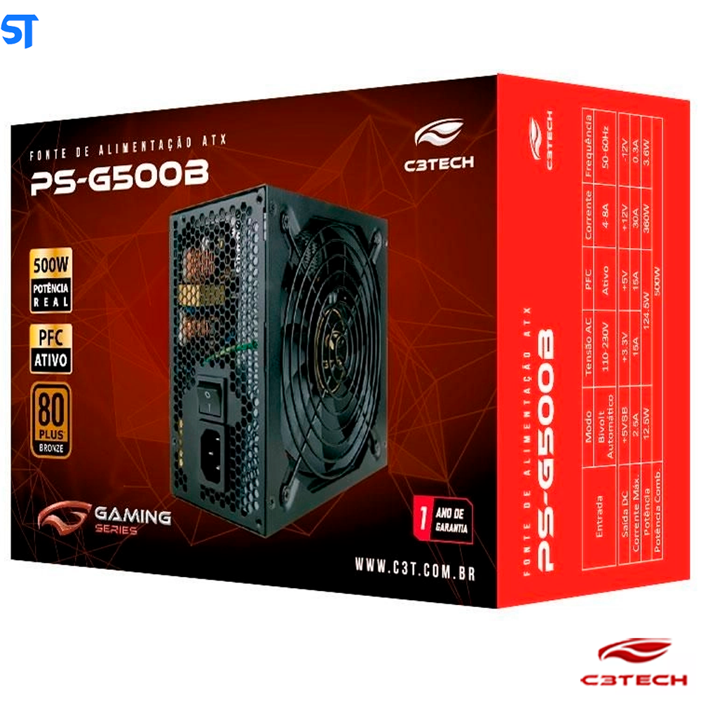 Mais qualidade para seu PC com a fonte de alimentação ps-g500b; com 500 watts de potência real e a certificação 80 plus bronze, essa fonte oferece energia eficiente sem desperdício, garantindo a refrigeração ideal para seu pc; uma das melhores opções do mercado garantindo segurança, desempenho e tranquilidade durante seu funcionamento