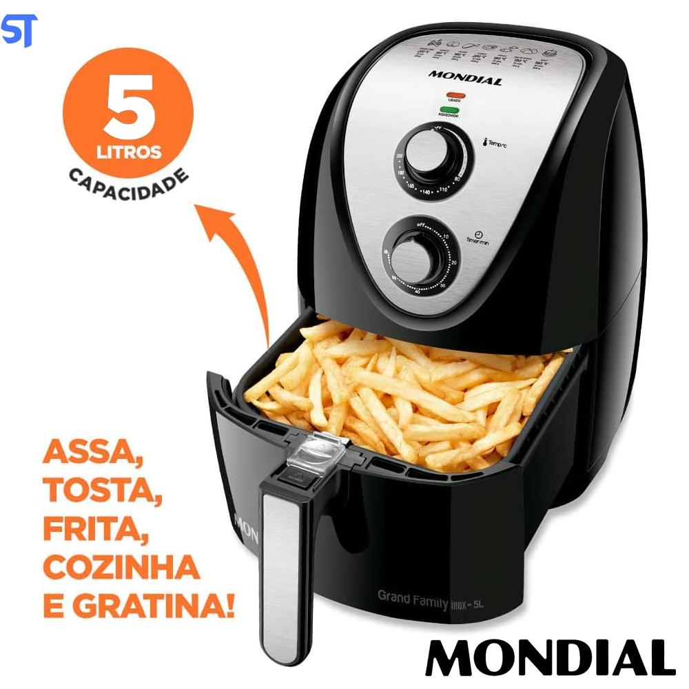 "A Air Fryer Mondial pode levar praticidade e alimentação saudável para a sua rotina diária. E, com o cesto com capacidade de 5 litros, você pode compartilhar esses benefícios com toda a sua família! A Tecnologia de Circulação de Ar Quente cozinha, frita (a ar), assa ou tosta os alimentos sem precisar adicionar óleo ou manteiga. Aliada à alta potência, a tecnologia da Fritadeira a Ar também possibilita rapidez nos preparos. Saiba mais sobre a AFN-50-BI: