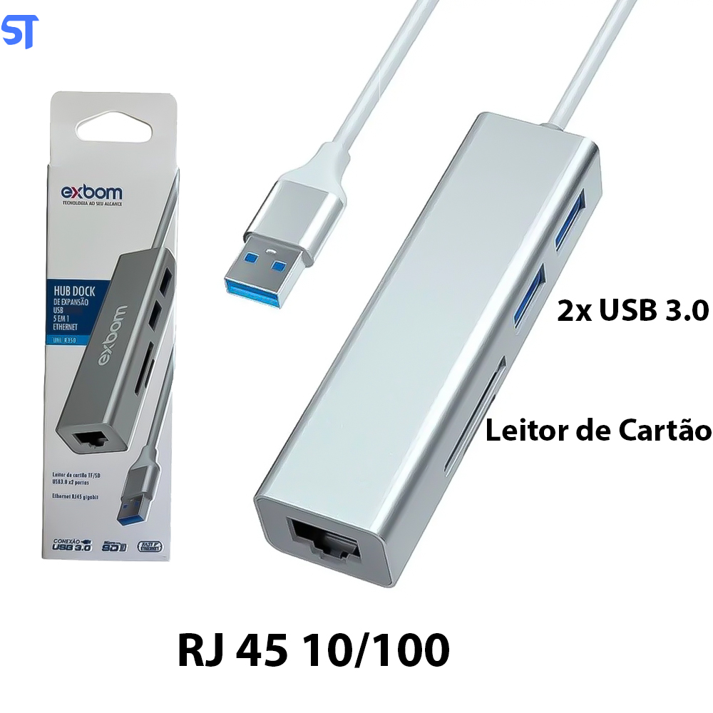 Hub Dock de Expansão USB 3.0 com 2 Portas USB 3.0 + Leitor de Cartão TF/SD + Ethernet RJ45 10/100Mbps Exbom UHL-R350