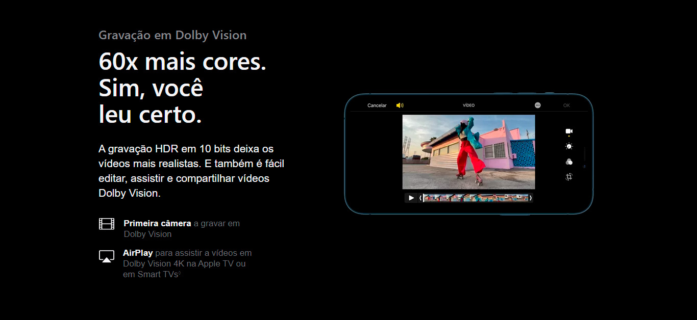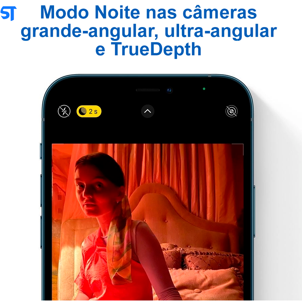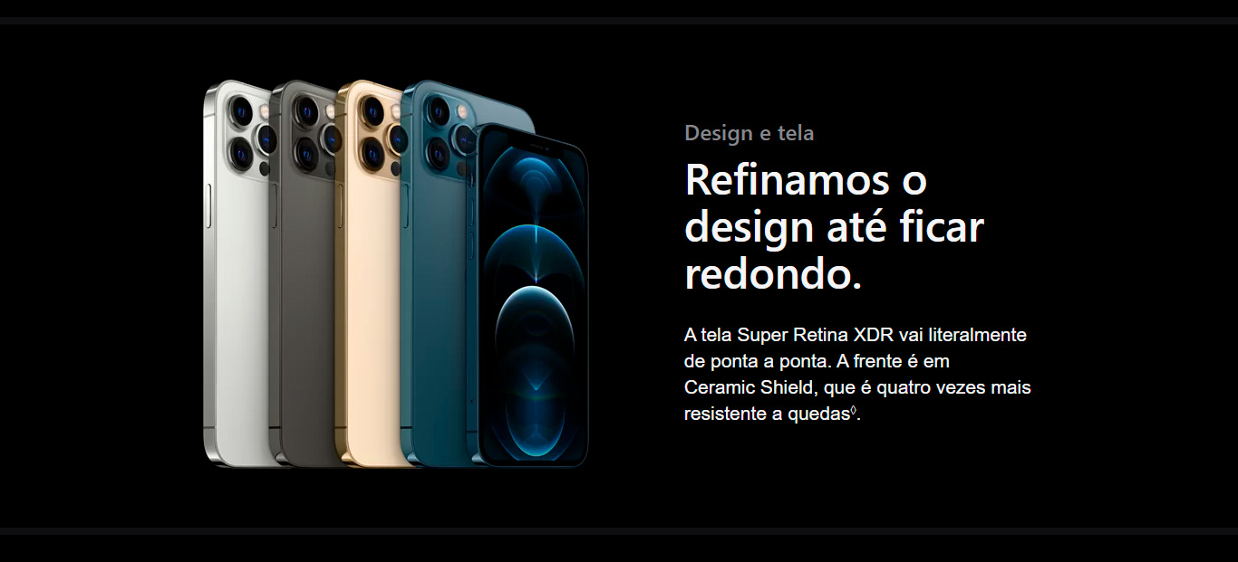 iPhone 12 Pro. Tela Super Retina XDR brilhante de 6,1 polegadas. Ceramic Shield, que é quatro vezes mais resistente a quedas. Fotos surpreendentes em pouca luz com o novo sistema de câmera Pro e alcance de zoom óptico de 4x. Reprodução, edição e gravação de vídeos em Dolby Vision com qualidade de cinema. Retratos com modo Noite e experiências ainda melhores em realidade aumentada com o Scanner LiDAR. Com poderoso chip A14 Bionic. Compatível com 5G. E novos acessórios MagSafe com encaixe fácil e recarga sem fio mais rápida.