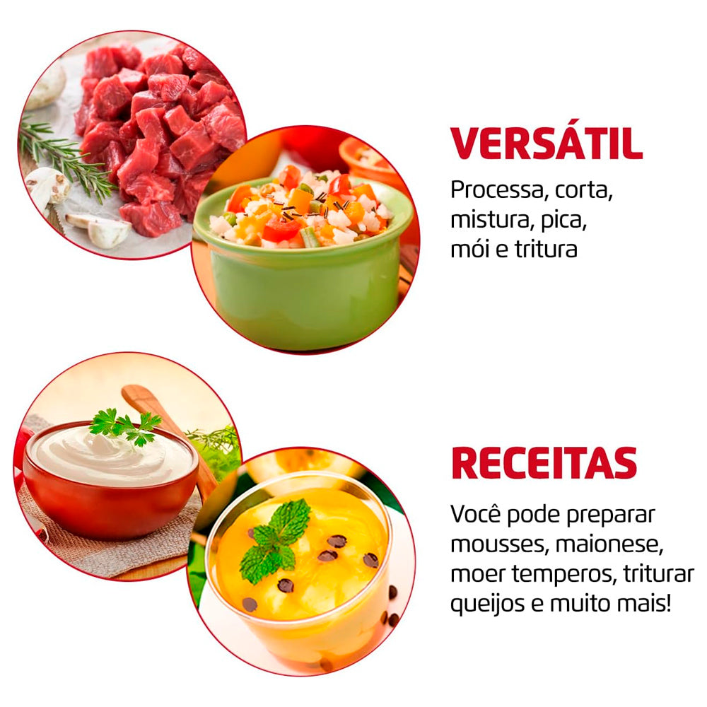 VERSATILIDADE DE RECEITAS: O mini processador Mondial processa, corta, mistura, pica, mói e tritura. Você pode preparar mousses, maionese, moer temperos, triturar queijos e muito mais.