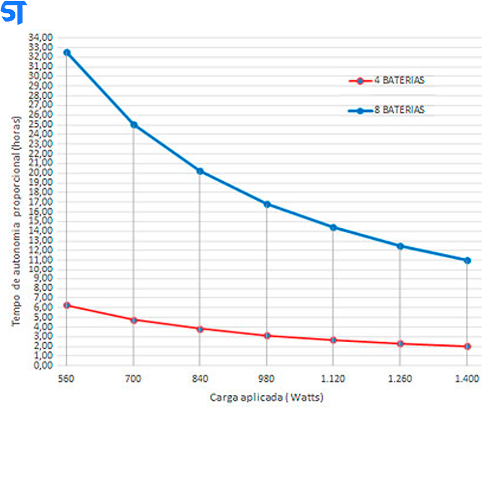 - Meia carga 700 W (utilizando 4 baterias de 12 V / 100 A): 4 h. 46 min.