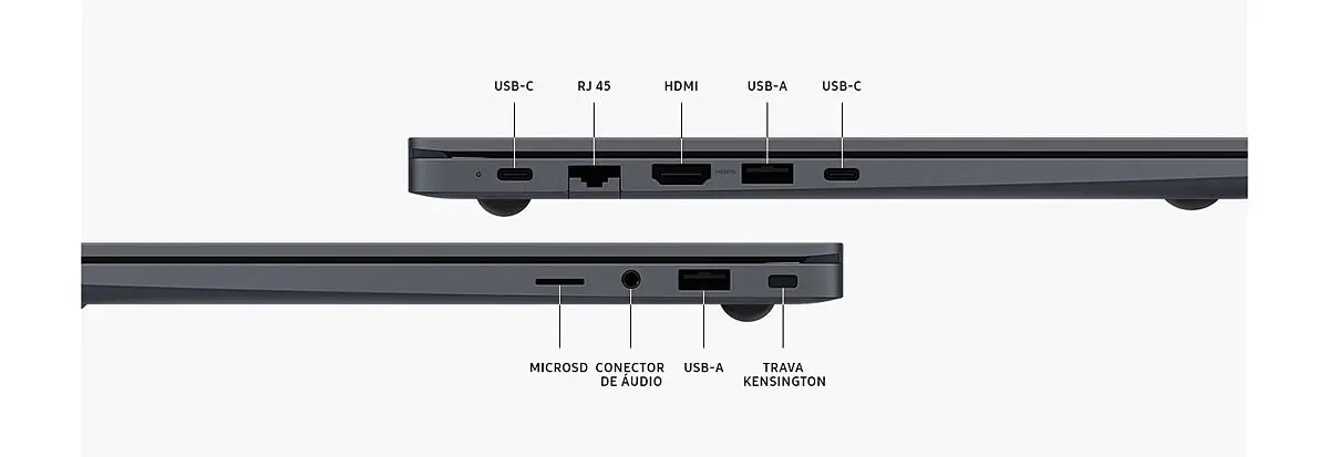 Fino e poderoso, o Galaxy Book4 possui uma ampla variedade de portas integradas para atender às suas necessidades de conectividade. Conecte dispositivos externos via HDMI, duas portas USB-A e duas portas USB-C, slot microSD e até mesmo uma porta RJ45 para conexões LAN de alta velocidade.
