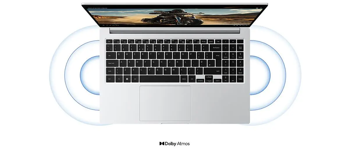 Ouça e sinta a ação em jogos e filmes com áudio imersivo dos alto-falantes duplos do Galaxy Book4. Refinados com Dolby Atmos, os alto-falantes cercam você com um som nítido e rico que leva seu entretenimento a um novo patamar.