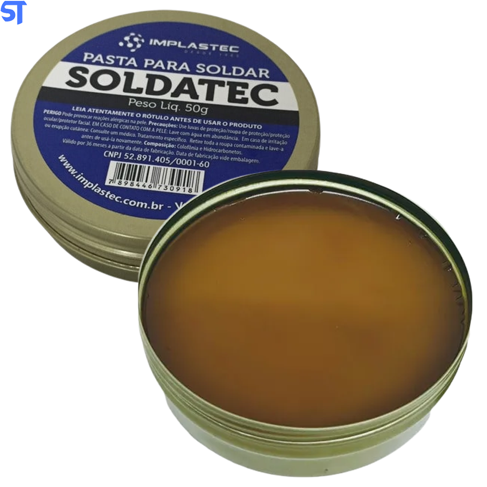 A Pasta de Solda Soldatec é um produto químico formulado a base de colofônia (breu), sem propriedade condutora, amplamente utilizado na área de manutenção eletrônica, tendo papel importante no processo de soldagem e dessoldagem pois ajuda no processo de molhagem e na remoção da oxidação.