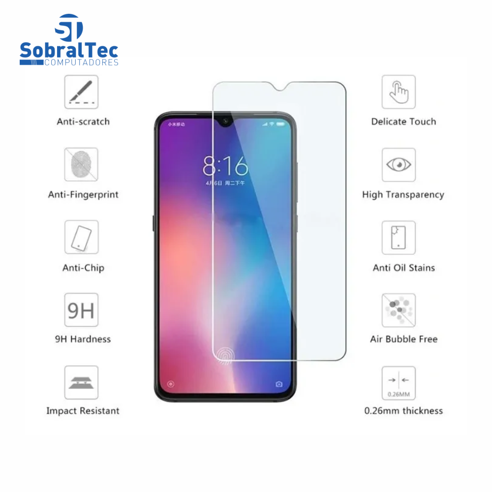 - Vidro temperado quimicamente com uma dureza de 9H, muito resistente a riscos e choques.