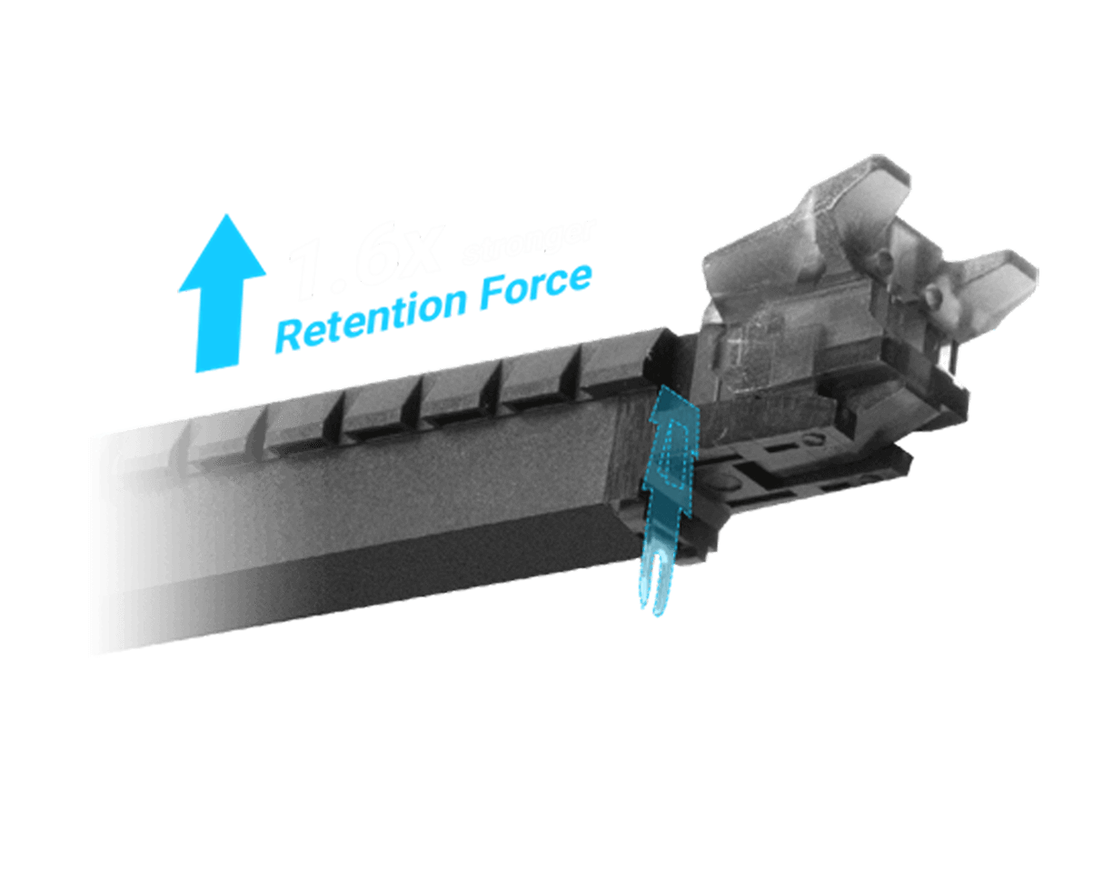 A SafeSlot Core é uma ranhura PCIe® exclusiva da ASUS. Com um design reforçado ancorado à motherboard através de um gancho especial, a Safeslot Core oferece uma retenção 1.6X superior e resistência 1.3X superior à das ranhuras de expansão standard.
