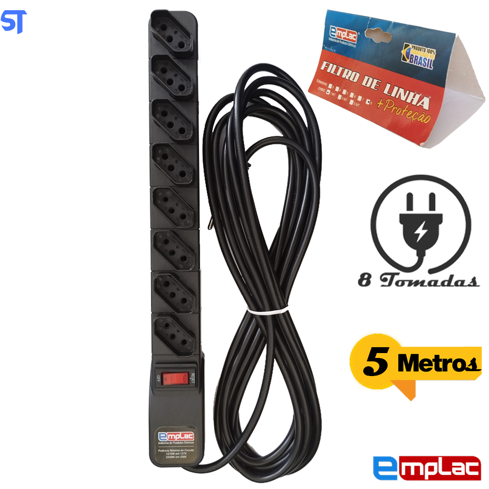 Filtro de Linha 8 Tomadas 10A Bivolt com Cabo de 5 Metros Certificado Régua de Energia Emplac F50187
