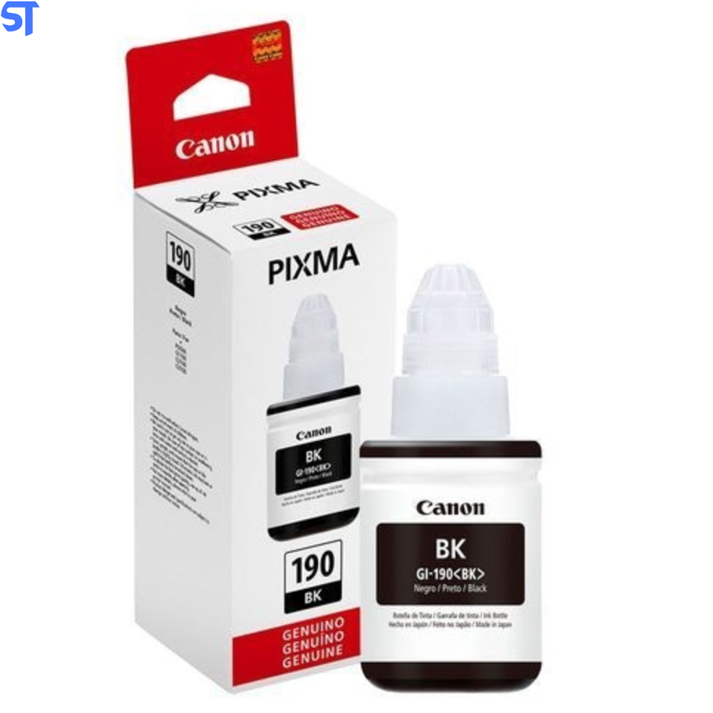 Refil de Tinta Canon GI-190 BK Preto 135ml, é usado nos modelos de impressora que possuem tanque de tinta. G1100, G2100, G3100, G3102.
