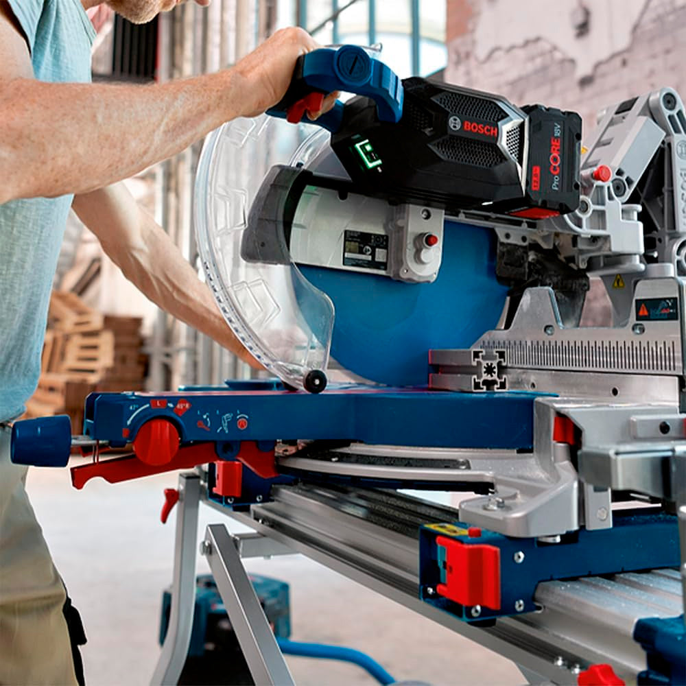 O desempenho máximo é alcançado em combinação com a bateria Bosch ProCORE 18V. Corresponde a até 2000 watts de potência de uma Serra de Esquadria com fio.