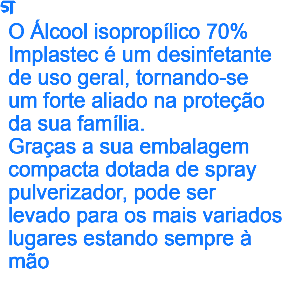 O Álcool isopropílico 70% Implastec é um desinfetante de uso geral, tornando-se um forte aliado na proteção da sua família.