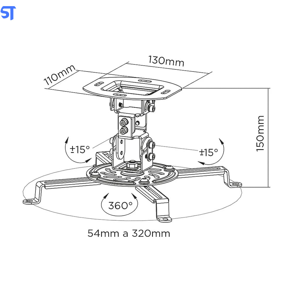 Abrangência de fixação: O afastamento entre os pontos roscados presentes no projetor deve estar entre os limites de 54 até 320 mm (diâmetro) para que possam ser alcançados pelas hastes do suporte.