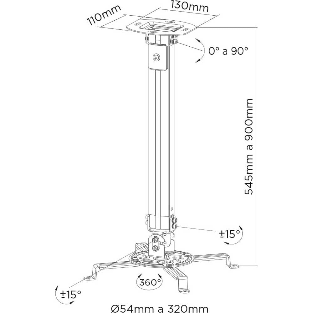 A base possui regulagem de altura com distância mínima do teto até o projetor de 54. 5 cm e máxima de 90 cm; ajuste preciso da imagem projetada!
