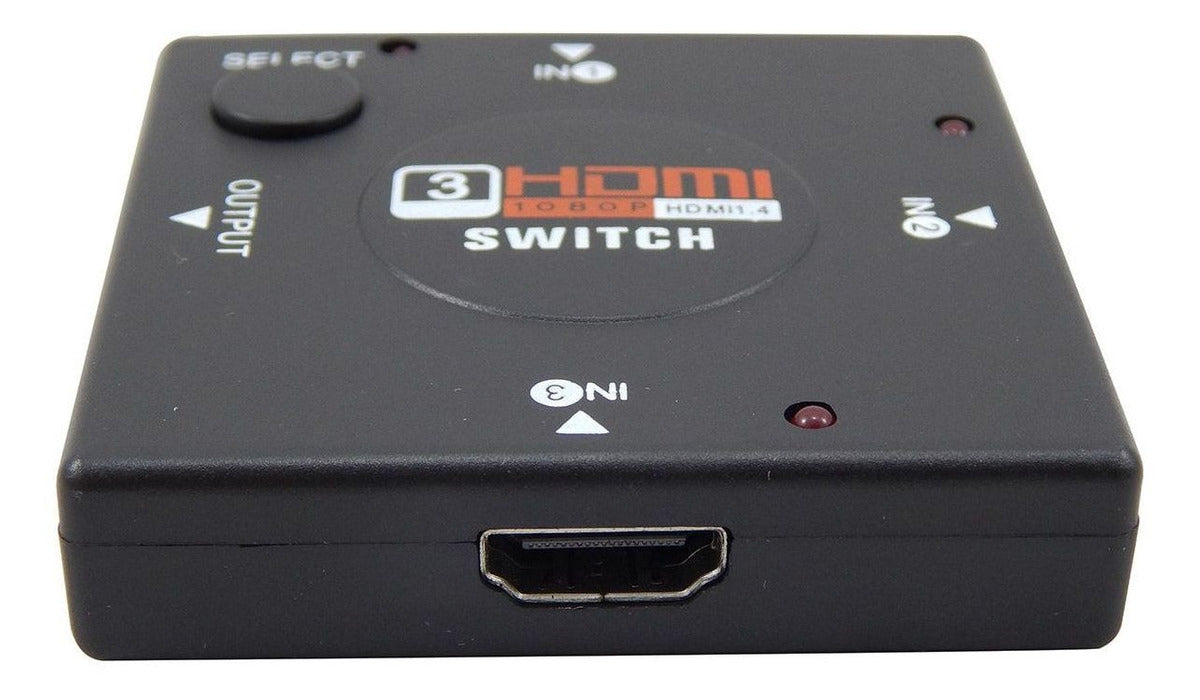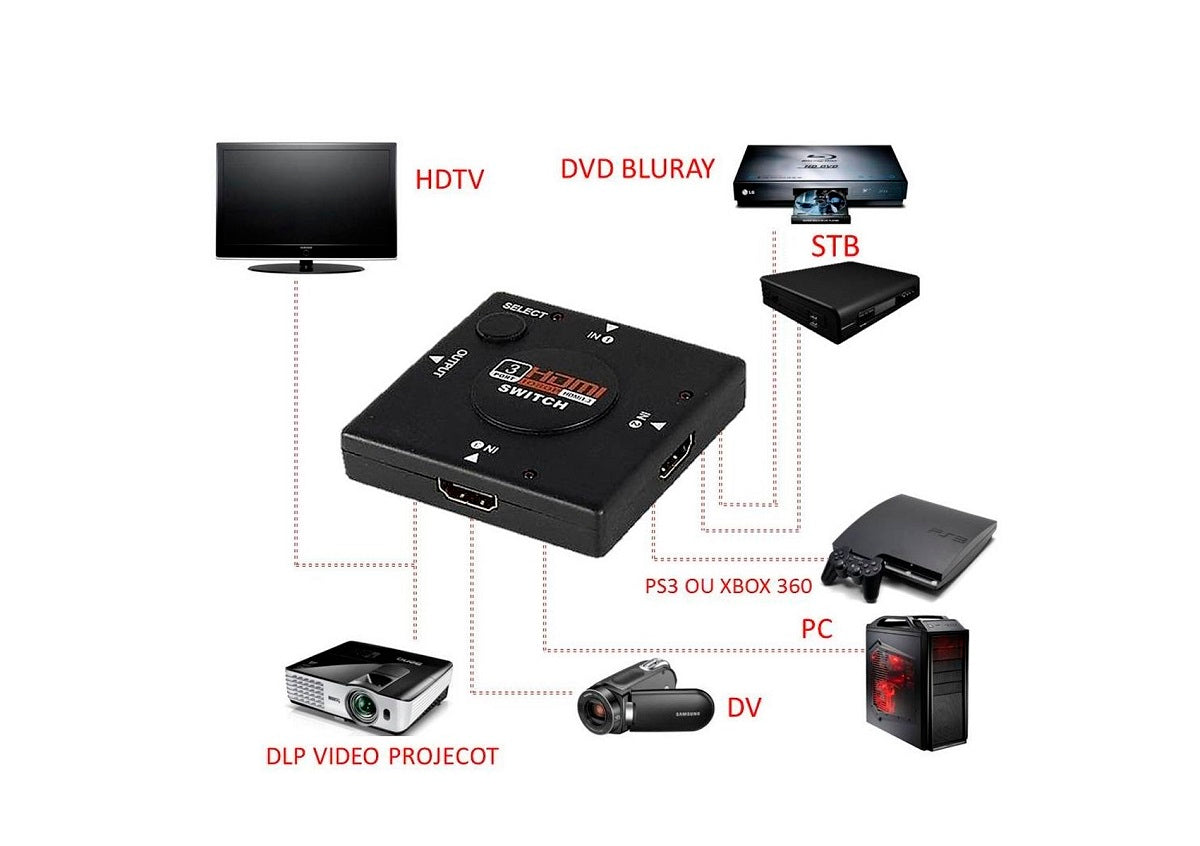 Então, utilizando este switch hdmi você não terá mais esse problema, porque você poderá conectar até 3 equipamentos HDMI nas entradas de sinal do switch e ligar apenas um cabo da saída do switch para uma única porta HDMI da sua TV, podendo escolher qual quer transmitir para tv de maneira simples e rápida, apertando o botão seletor no switch.