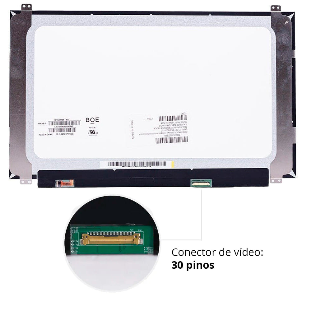 A fixação da Tela Tela 15.6" LED Slim é no modelo Fixação Superior / Inferior e com o conector do lado Inferior Direito, seguindo os padrões atuais de mercado.
