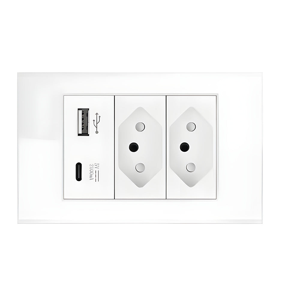 Tomada Padrão Brasileiro com Entrada USB e USB-C, 10A, Painel em Vidro Temperado - Branco