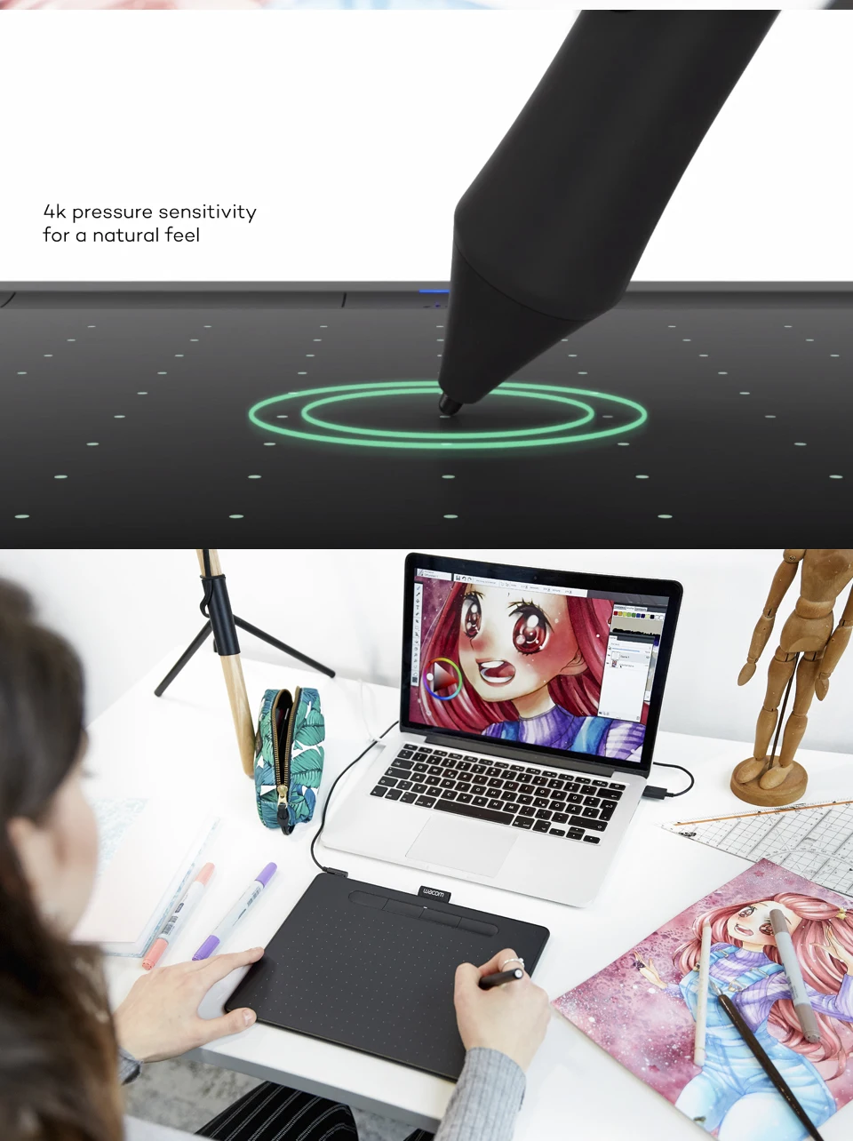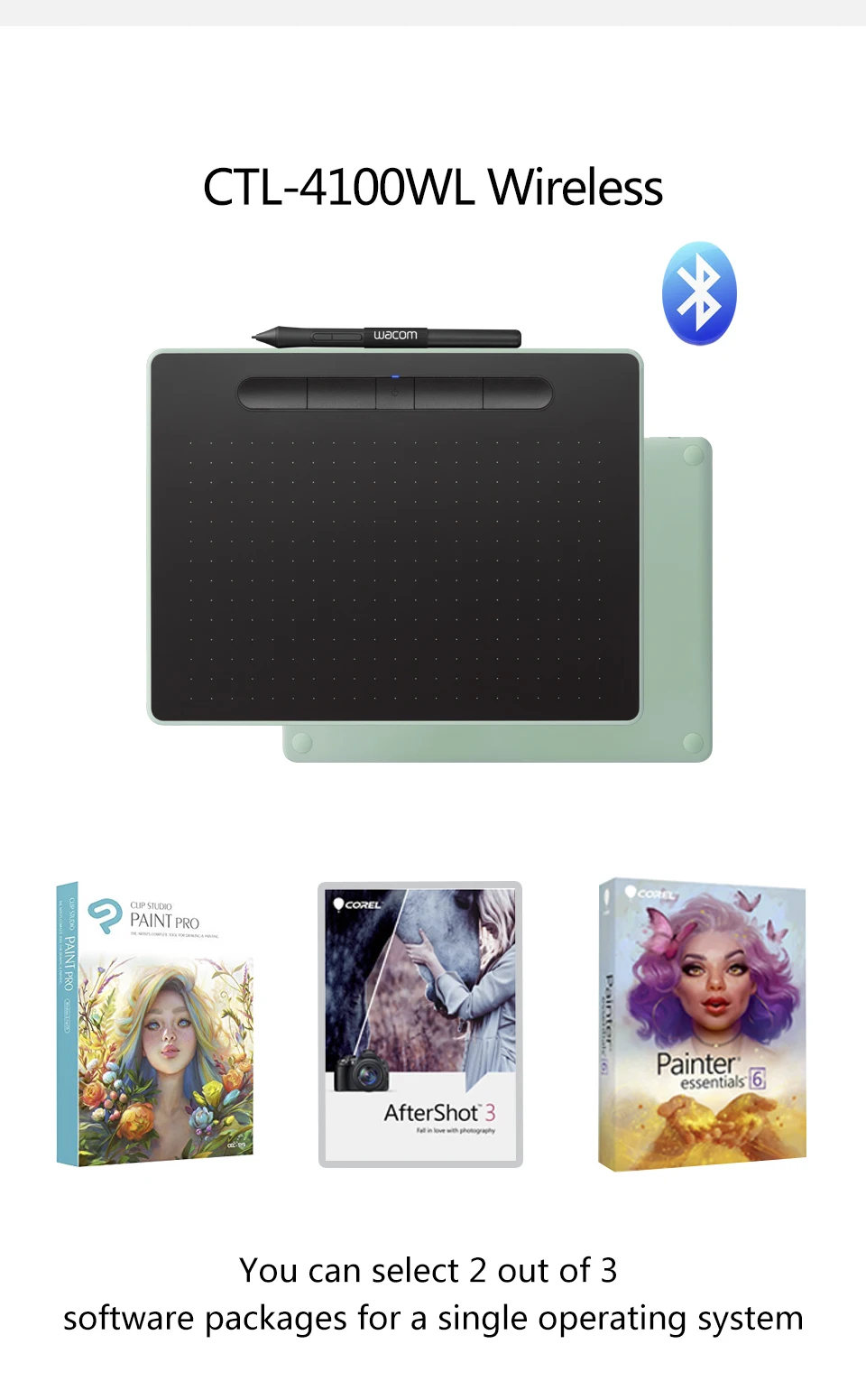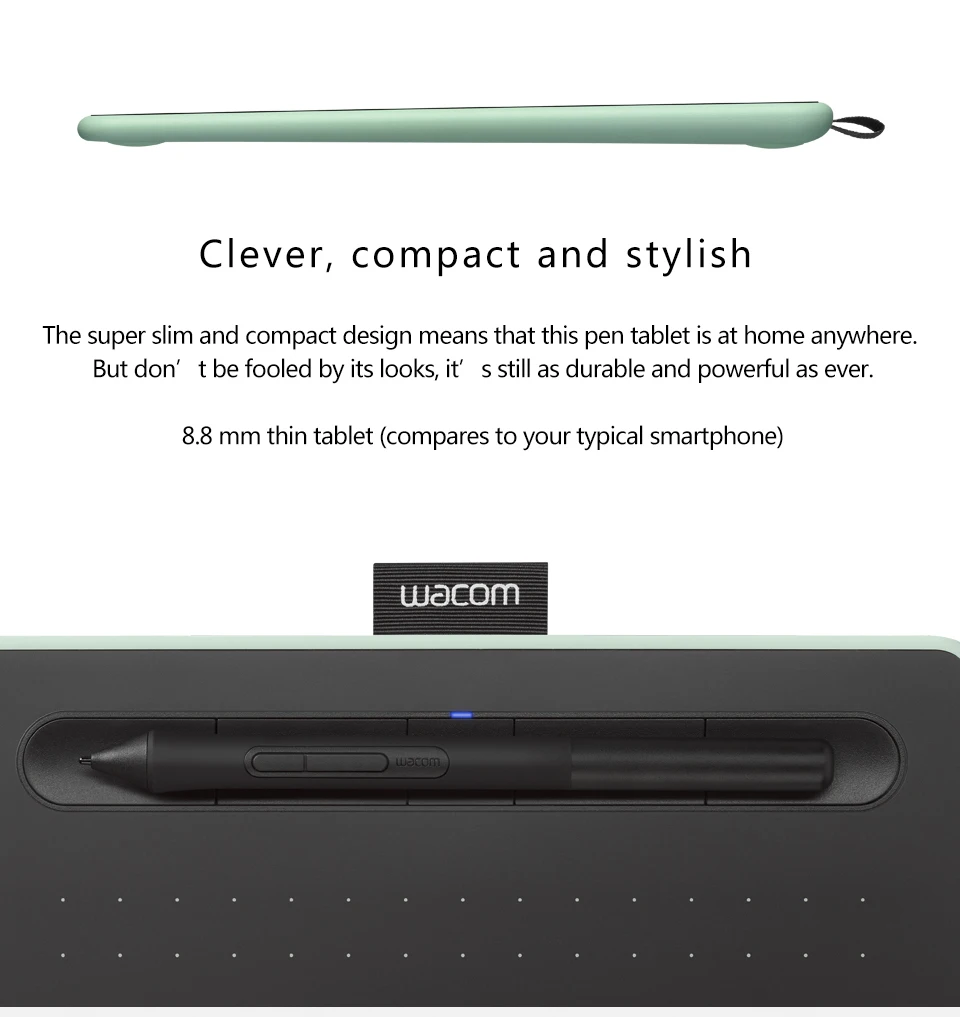 Tipo de produto: tablet com caneta sensível à pressão, sem fio, sem bateria Número modelo: Pequeno: CTL-4100, CTL-4100WL (modelo bluetooth) Tamanho Tablet 200x160x8.8mm / 7.87x6.3x0.35 dentro Área ativa: 152.0x95.0mm (6.0x3.7 in) Cor CTL-4100 (preto) CTL-4100WL (preto, verde pistache) Expresskeys: sim-4 configurações específicas customizáveis da aplicação Níveis de pressão: 4096 Multi-toque: não Suporte sem fio Sim-clássico bluetooth em modelos bluetooth (CTL-4100WL) Ligar/desligar/bluetooth botão de emparelhamento Sim-em modelos bluetooth (CTL-4100WL) Botão de Reset Sim-em modelos bluetooth (CTL-4100WL). As configurações são salvas do bluetooth Peso: CTL-4100: 230g (8.1oz) CTL-4100WL: 250g (8.8oz) Caneta: 11.2g (0.4oz) incluindo 3 pontas Resolução: 2540 lpi Caneta: wacom caneta 4k (LP-1100K) Cabo incluído: sim-1.5 m (4.9 pés), pvc-livre, usb tipo a para micro b cabo com l-forma plug Segurança: um entalhe do tirante Impulsionadores de produtividade: menu radial, alavanca de exibição e teclado na tela disponível em todos os modelos Bateria: sim-built-in, bateria li-ion não substituível em modelos bluetooth apenas CTL-4100WL Tempo de operação contínua/tempo de carregamento 15 horas no mínimo, até 3.5 horas (apenas em modelos bluetooth) Requisitos do sistema Windows 7, 8.1 ou 10 (excluindo windows 10 s; mais recente pacote de serviço/compilação), macos x 10.11 ou posterior (última atualização), smartphone android e/ou tablet (versão do sistema operacional 6.0 e acima) Com características otg, padrão porta usb tipo-a, bluetooth clássico para conexão sem fio (modelos bluetooth apenas: CTL-4100WL, , acesso à internet para baixar driver para tablet para trabalhar e para selecionar software downloadable * Velocidade de leitura (caneta): 133 pps O que está incluído Wacom intuos creative caneta tablet pequeno ou médio, com ou sem bluetooth, Pressão-sensível, sem bateria wacom caneta 4k, Cabo usb sem pvc com cabo arrumado e conector em forma de l, 3 pontas padrão extra (localizado dentro da caneta), Ferramenta de remoção de nib na extremidade da caneta, Guia de início rápido, Folha de regulação, Guia de usuário online e informações importantes sobre o produto encontradas em wacom desktop cento Software incluído 3 software criativo incluído: Corel®Pintor®Fundamentos™7 (64bit)* Corel®AfterShot™Pro 3 (64bit)* Clip studio paint pro * *